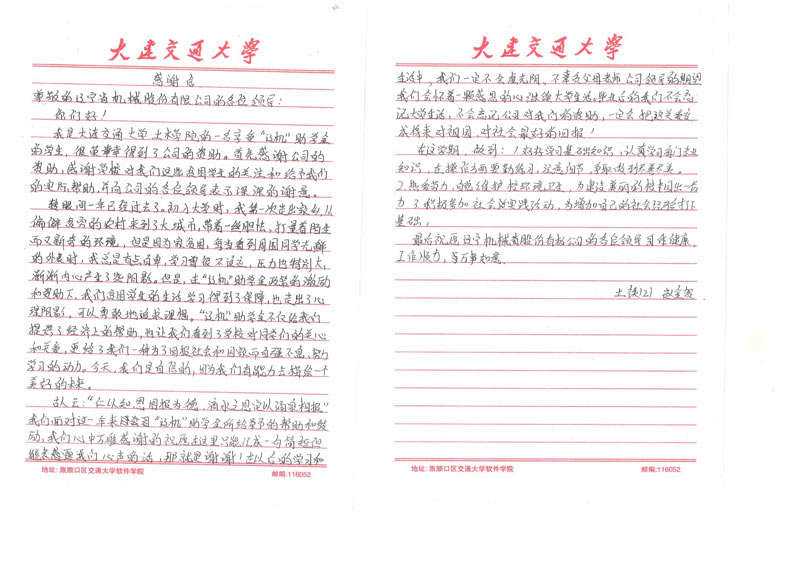 近日,公司收到一封來自大連交通大學的感謝信。寄信人是交通大學土木學院一名大二學生,系2012年遼機助學金的獲得者。在信中,他表示:感謝公司的資助,并🧑🏽🤝🧑🏻向公司的各位領導表示深深的謝意。在遼🌈機助學金政策的激⛷️勵和資助下,我們貧困學生的🌈生活學習得🧡到了保障,也📐走出了心裡的陰影,可以勇敢的追求理想,更給了我們📐一種為了回報社會以及國家🤩自強不息、努力學習的動力。