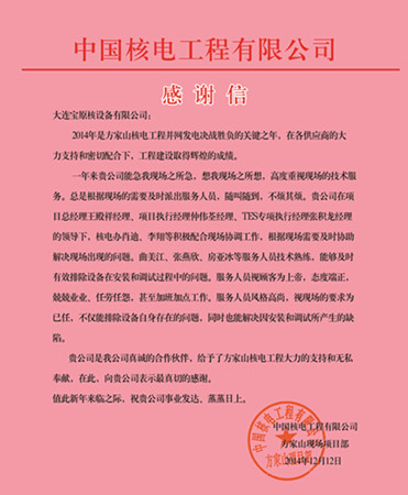 12月4日,大連寶原核設備有限公司收到來自方家山現場⁉️項目部的感謝信.